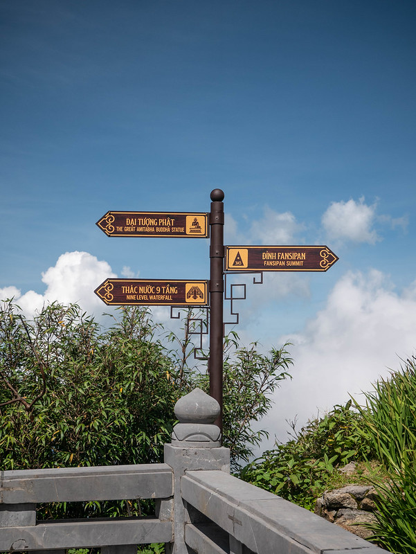 To get to the 3,143m peak, you can get a further funicular or press on foot up the steps and through the clouds. We did the latter. There’s further temple areas, viewpoints and finally the peak and a splendid viewing platform where one can have fun with flags.